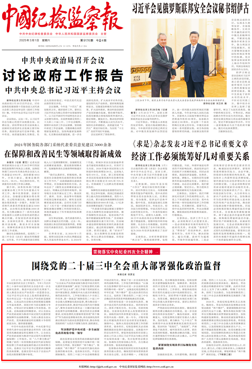 加强政治监督,方向要明确,路径要正确。党的二十大以来,习近平总书记多次就推进政治监督具体化、精准化、常态化提出明确要求和专门部署,此次在四次全会上又作了深入阐释,明确了方向任务,指明了方法路径,为监督保障党的二十届三中全会决策部署落地见效提供了重要遵循。